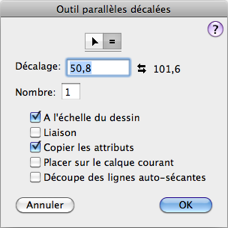q Appuyez sur la touche Option et sélectionnez l’outil Décalage des parallèles de la palette des WildTools. La fenêtre de dialogue suivante apparaît :