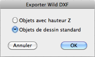 Exporte les objets vectoriels PowerCADD (lignes, rectangles, polygones, etc. sauf le texte, les lignes de cotation, les bitmaps ect.) dans un fichier DXF. Vous avez le choix d'exporter les objets de dessin standard ou les objets avec une hauteur Z.