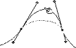 Si l’outil ne peut pas dessiner, le pointeur d’étirement est disponible, il indique que l’outil est en train d’étirer (déplacer) une partie quelconque de la Bézier. Il peut étirer les poignées ou les segments de la Bézier. S’il est impossible de réaliser une opération d’étirement (simplement parce qu’il n’est pas au-dessus de l’objet ou sur une poignée), le pointeur d’étirement passe en blanc (ou en creux). Ce qui signifie : ”je suis en mode étirement, mais pour l’instant cette opération m’est impossible”. |