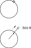 q Sélectionnez l’outil Cotation radiale de la palette des outils de Cotation des WildTools. q Positionnez le pointeur sur un cercle ou un arc du dessin que vous souhaitez coter. Appuyez sur le bouton de la souris. q Étirez la ligne au-delà de l’objet. Vous pouvez appuyer sur la touche Option pour permuter entre le dessin des flèches internes ou externes. Vous pouvez déplacer la souris de gauche à droite de 45° pour inverser le support de la cote radiale à droite ou à gauche. q Relâchez le bouton de la souris pour achever l’opération de cotation radiale. |